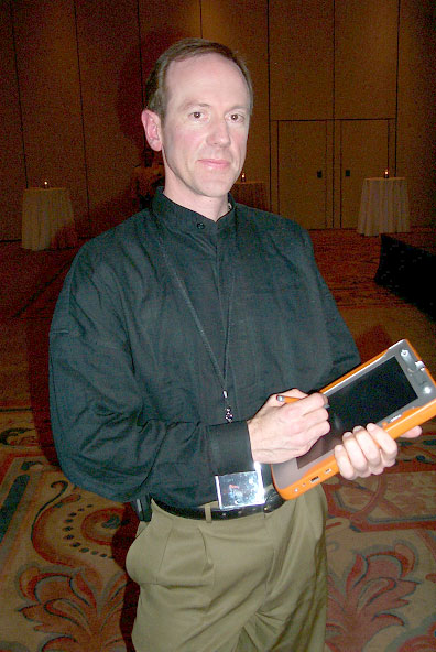 Microsoft product manager Bert Keely shows off the Tablet PC at the press reception after the Gates keynote. Yes, it's very cool.