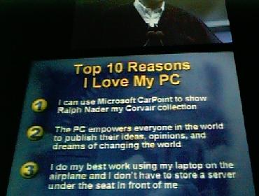 nice jabs at Ralph Nader ("I can use Microsoft PowerPoint to show Ralph