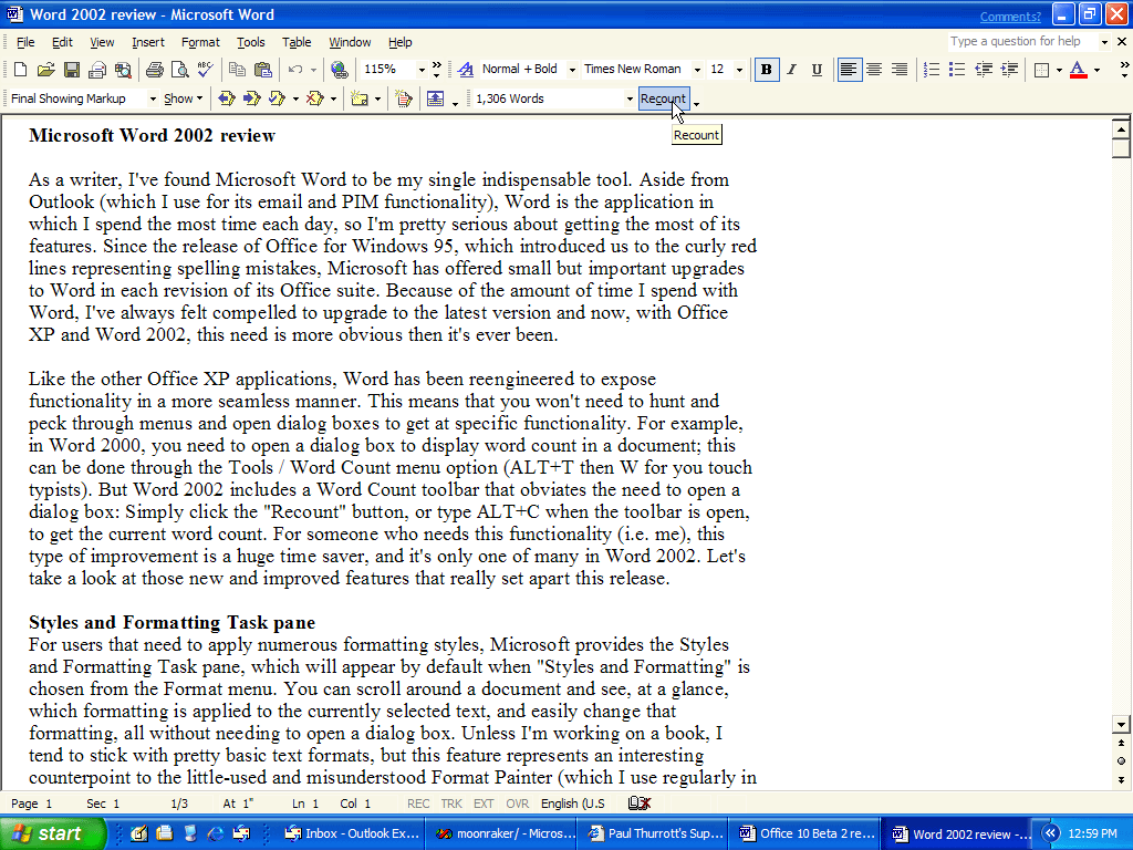 Like the other Office XP applications, Word has been reengineered to expose functionality in a more seamless manner. This means that you won't need to hunt and peck through menus and open dialog boxes to get at specific functionality. For example, in Word 2000, you need to open a dialog box to display word count in a document; this can be done through the Tools / Word Count menu option (ALT+T then W for you touch typists). But Word 2002 includes a Word Count toolbar that obviates the need to open a dialog box: Simply click the "Recount" button, or type ALT+C when the toolbar is open, to get the current word count (Figure). For someone who needs this functionality (i.e. me), this type of improvement is a huge time saver, and it's only one of many in Word 2002. Let's take a look at those new and improved features that really set apart this release.