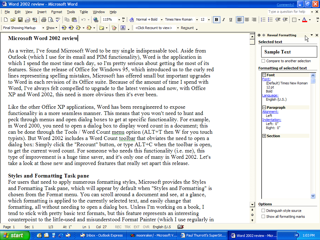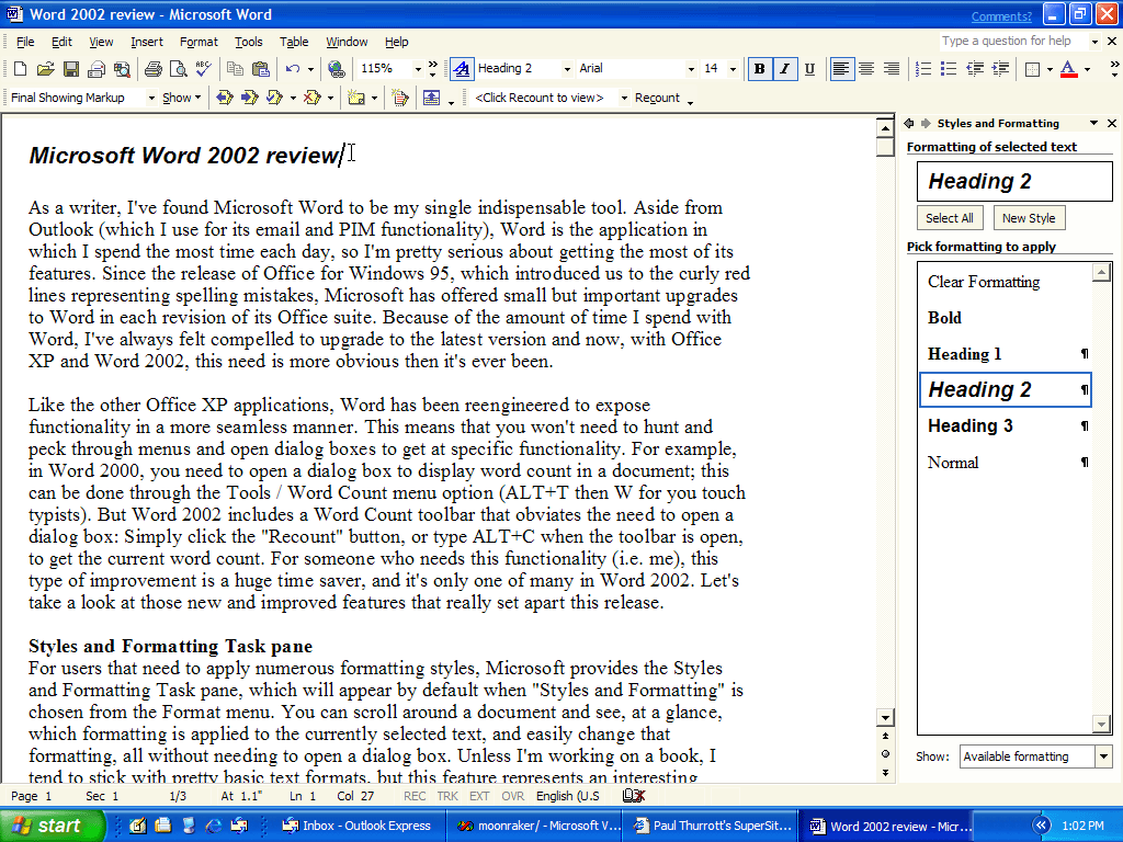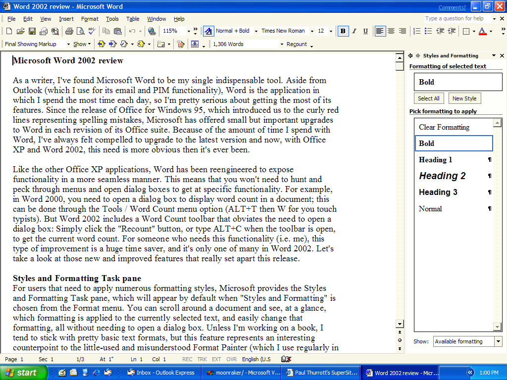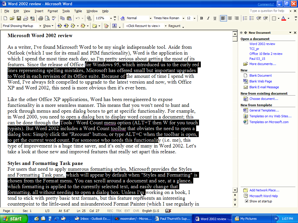 As a writer, I've found Microsoft Word to be my single indispensable tool. Aside from Outlook (which I use for its email and PIM functionality), Word is the application in which I spend the most time each day, so I'm pretty serious about getting the most of its features. Since the release of Office for Windows 95, which introduced us to the curly red lines representing spelling mistakes, Microsoft has offered small but important upgrades to Word in each revision of its Office suite. Because of the amount of time I spend with Word, I've always felt compelled to upgrade to the latest version and now, with Office XP and Word 2002, this need is more obvious then it's ever been.