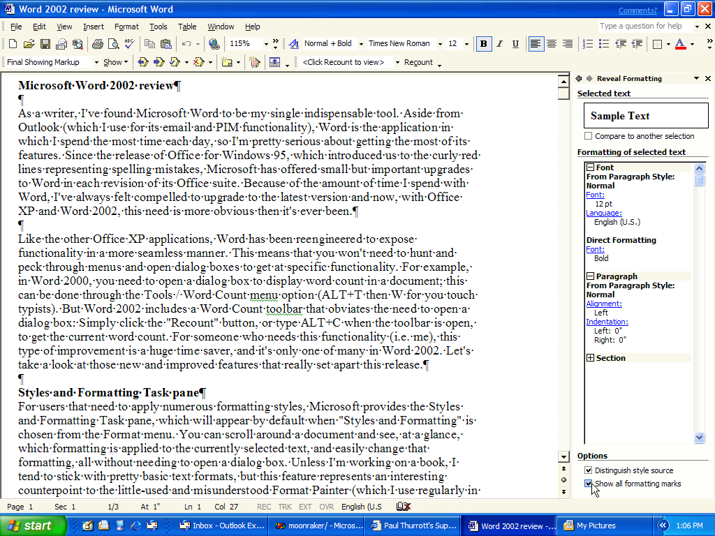 For more advanced formatting needs, Microsoft supplies the Reveal Formatting Task pane (Figure), which will display, at any point in the current document, the font, paragraph, spacing, image, table, and other properties. The Reveal Formatting Task pane also allows you to compare two text selections to see whether they contain identical formatting, and then apply the formatting of one selection to the other if desired. This option is enabled by choosing Reveal Formatting from the Format menu. If you'd like to compare two selections, highlight the first selection in the current document, check the "Compare to another selection" option, and then select the second location. This pane can also be used to show all formatting marks, which used to require a visit to the Options dialog box (Figure).