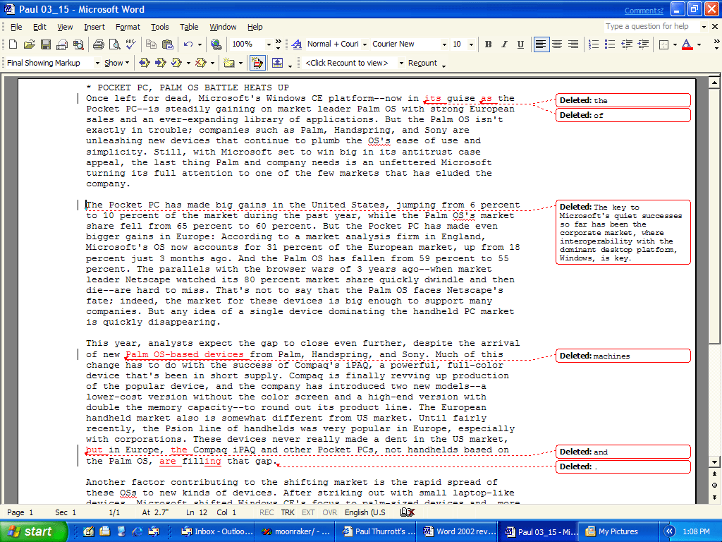 One Word feature I use every day is Track Changes, and it's gotten much better in Word 2002: It allows you to keep track of changes that are made to a document by different users. In my case, Track Changes is essential because I submit articles to Windows 2000 Magazine that are then tech edited and returned to me for further edits (Figure). In Word 2000, Track Changes assigns a different color to each author's edits, so it's easy to see who did what. But Word 2002 uses a new Markup feature which emulates the way people used to hand-edit documents: Graphical "call outs" to changes are made in the right column (Print Layout only), so that the main text of the document doesn't get cluttered. This makes a heavily edited document much, much easier to read. And if you've been writing for a while, as I have, the nostalgia effect of seeing a digital version of hand-editing is not to be missed.