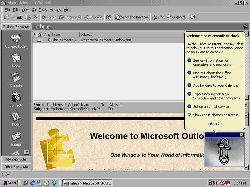 the annoying Office Assistant. Despite this, Outlook 98 installed the