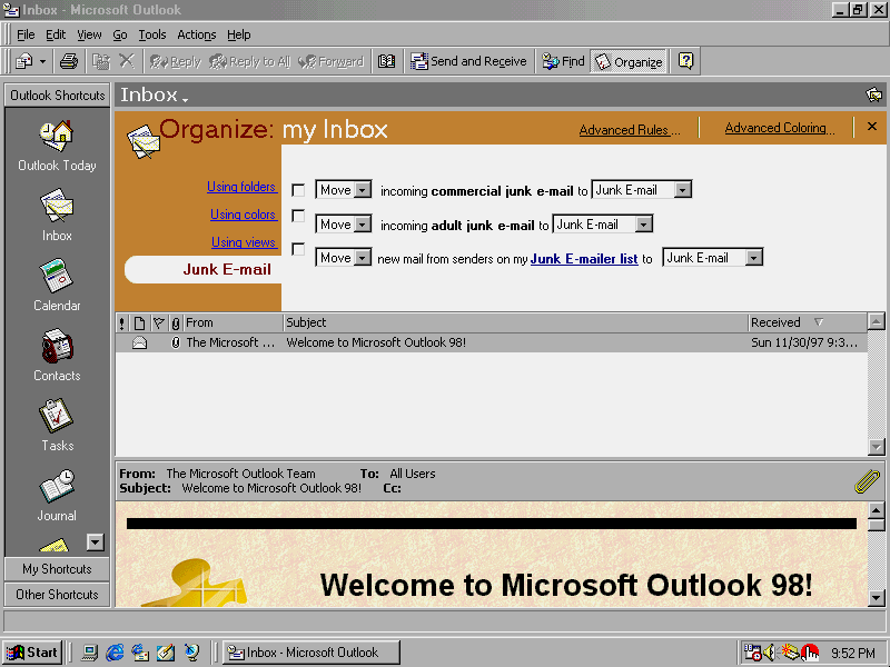 Outlook 98's Organize feature allows you to filter junk email from your Inbox.