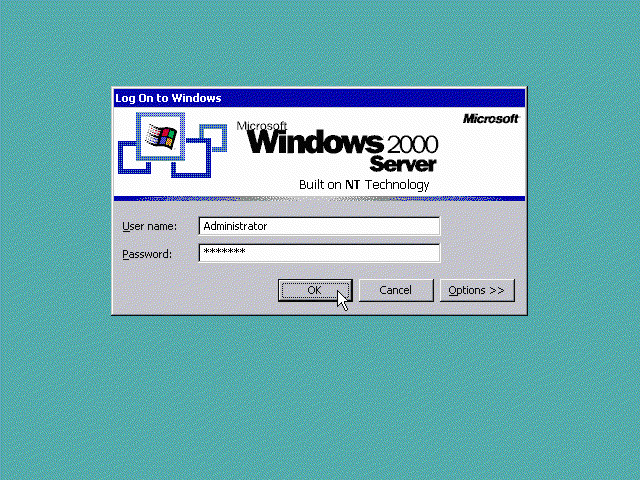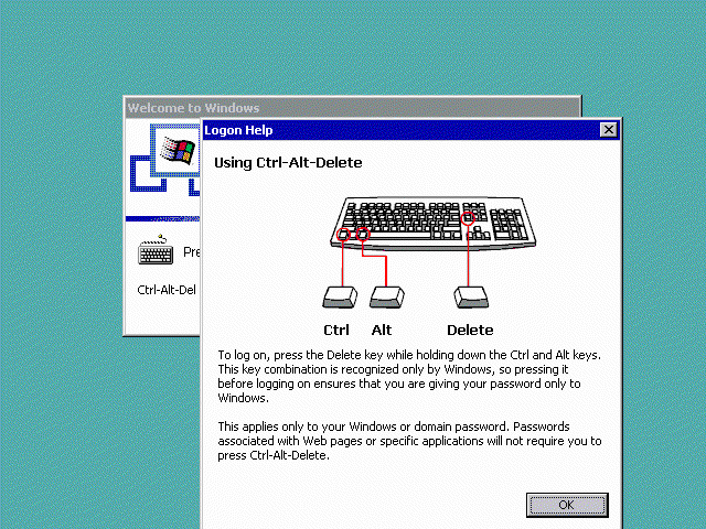 You login to a system from the Welcome to Windows dialog that appears when you first turn on a Windows 2000 system (Figure). This dialog also appears when a user logs off of a system so that another user session can begin. To login to a Windows 2000 Server machine, you must first type CTRL+ALT+DEL, a key sequence that transcends time and legend, it seems, and owes its existence to the beginning days of Windows. The so-called three-fingered salute was designed as a way to initiate an action that shouldn't occur by mistake; thus, a three-key, rather than a two-key action such as CTRL+S, was invented (Figure). In any event, the CTRL+ALT+DEL keystroke causes the Log on to Windows dialog to appear (Figure). This dialog prompts the user for a user name and password. Windows passwords are case sensitive (secret and Secret are not the same) and can consist of one to fourteen characters.