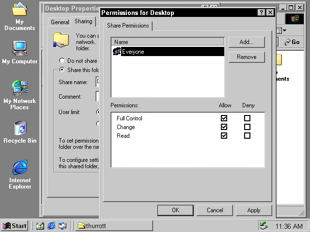 You can optionally limit the number of concurrent connections to the share or accept the default, which is unlimited. The most important option, however, is Permissions, which allows you to determine which users have the rights to access this resource. Pressing the Permissions button displays the Permissions dialog for the folder, allowing you to add and remove users and groups from the list (Figure). The default for any share is Everyone with full access (full control, change, and read permissions are all allowed). However, if you choose to manually add users or groups, the default for each addition is read only, so you will need to modify the permissions for each addition if they have more elaborate needs.