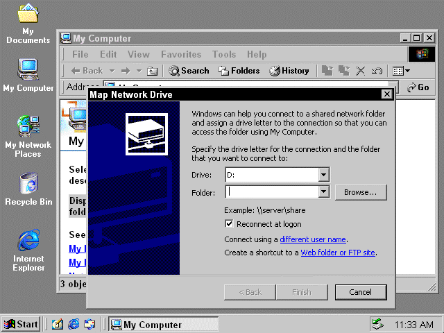 Windows NT 4.0 had icons in the My Computer and Explorer toolbars that allowed you to easily map and disconnect from network resources using a simple mouse click. These icons were removed from the default My Computer/Explorer toolbars in Windows 2000, but you can return them if you so desire. To do so, right-click the My Computer toolbar and choose Customize. The Customize dialog contains a list of available toolbar icons as well as a facing list of current toolbar icons. To add the Map Drive and Disconnect icons to the toolbar, simply double click them in the left pane of the Customize Toolbar dialog.
